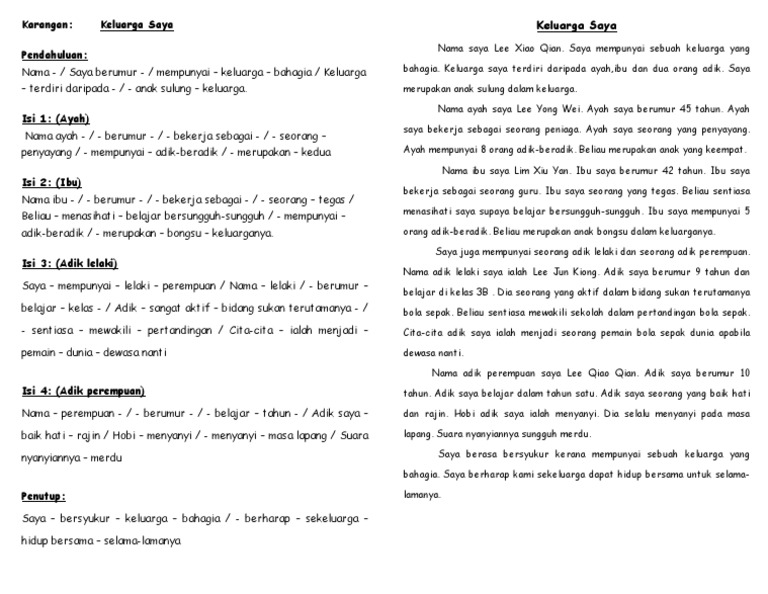 Contoh karangan diri saya tahun 2. Ayah saya ialah seorang guru dan mengajar. Contoh Karangan Kandungan Ciri-ciri untuk membina keluarga Impian saya Mewujudkan keluarga yang bahagia Ibu bapa hendak mengajar anak-anak Meluangkan masa dengan anak-anak Menuruti perintah ibu bapa Saling hormat menghormati Penutup Karangan Semua insan mengidamkan sebuah keluarga yang bahagia.
